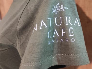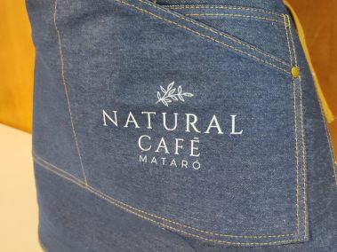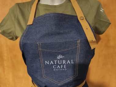 Tèxtil: roba de treball, davantals en texà per donar un aire modern i fresc serigrafiat amb el logo en blanc, un detall petit però ben definit.